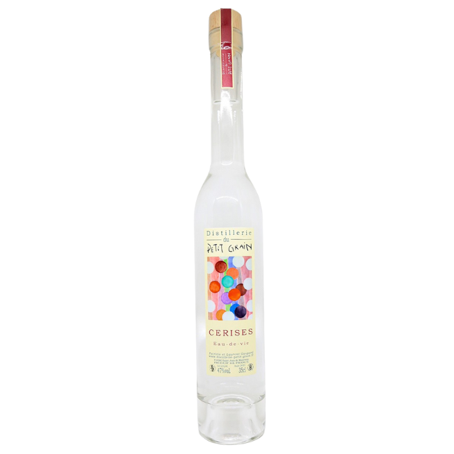 L’eau-de-vie évoque le clafoutis, avec les pointes laiteuses, d’amandes, de noix de Tonka et de violette. En bouche, elles laissent place à la netteté acide de la chair de cerise.