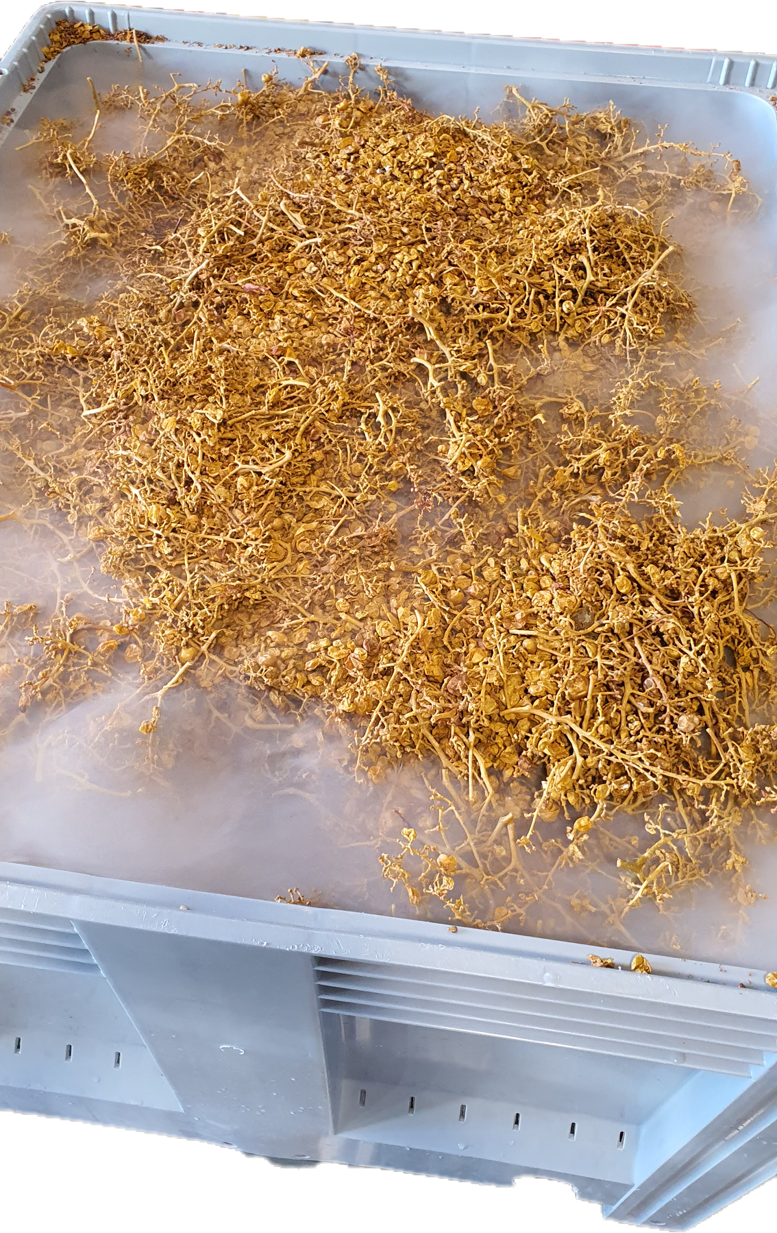 Ce travail, ce souci commun de la morbidezza du muscat nous ont donné le désir de distiller les marcs de cette cuvée si curieuse, et de la faire dialoguer avec notre Grains d’ambre.